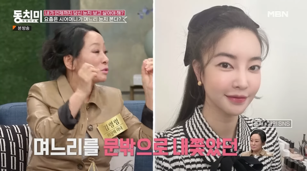 지난 4월 8일 방송된 MBN 속풀이쇼 동치미에서 김영임이 명절에 며느리 김윤지를 쫓아낸 사연을 밝혔습니다. 이날 방송에서 황혜영과 김영희는 일하는 며느리를 충분히 배려해주시는 시어머니를 자랑했습니다. 황혜영은 시어머니를 "황사장"이라 불러, 명절에 방에서 자는 일이 생겼다는 이야기를 하며 웃음을 자아냈고, 김영희는 시어머니가 오시면서 음식을 해놓지 말라는 말에 탕수육을 시켜 칭찬을 받은 적이 있다며 놀라움을 자아냈습니다.