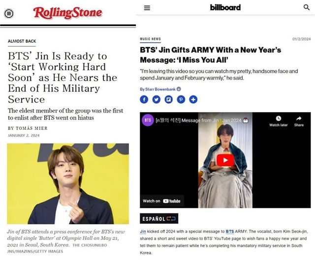 세계적으로 권위 있는 음악 매체인 빌보드 또한 'BTS' Jin Gifts ARMY With a New Year's Message: 'I Miss You All''이라는 제목의 기사에서 진의 복귀에 대한 기대를 나타냈다. 미국의 글로벌 엔터테인먼트 매체인 'SKPOP'은 '전역 30일 미만을 앞둔 방탄소년단 진: 입대부터 그가 일구어낸 수많은 성과를 되돌아보며'라는 제목의 기사에서 진의 군 복무 중 성과를 조명했다. 진이 입대 후 모범적이고 뛰어난 군 생활로 신병들의 중대장 훈련병이 되었으며, 훈련소 수료식에서 훈련생들을 진두지휘했다는 사실을 밝히며 그의 업적을 높이 평가했다.