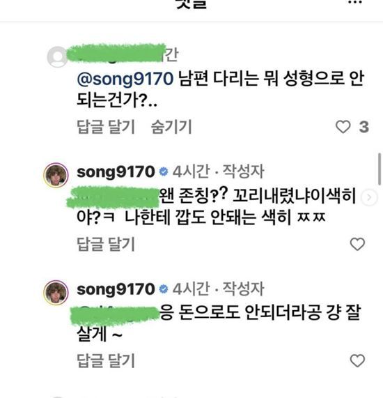 김송은 28일 자신의 개인 계정에 한 누리꾼이 남긴 댓글과 자신이 남긴 답을 캡처해 올렸다. 한 누리꾼은 김송의 게시물에 "남편 다리는 뭐 성형으로 안 되는 건가?"라는 댓글을 달았고, 무례한 발언에 마음이 상한 김송은 "웬 존칭? 꼬리 내렸냐 이 새X야. 나한테 깝도 안 되는 새X ㅉㅉ", "응 돈으로도 안 되더라고. 걍 잘 살게"라고 분노한 마음을 드러냈다.