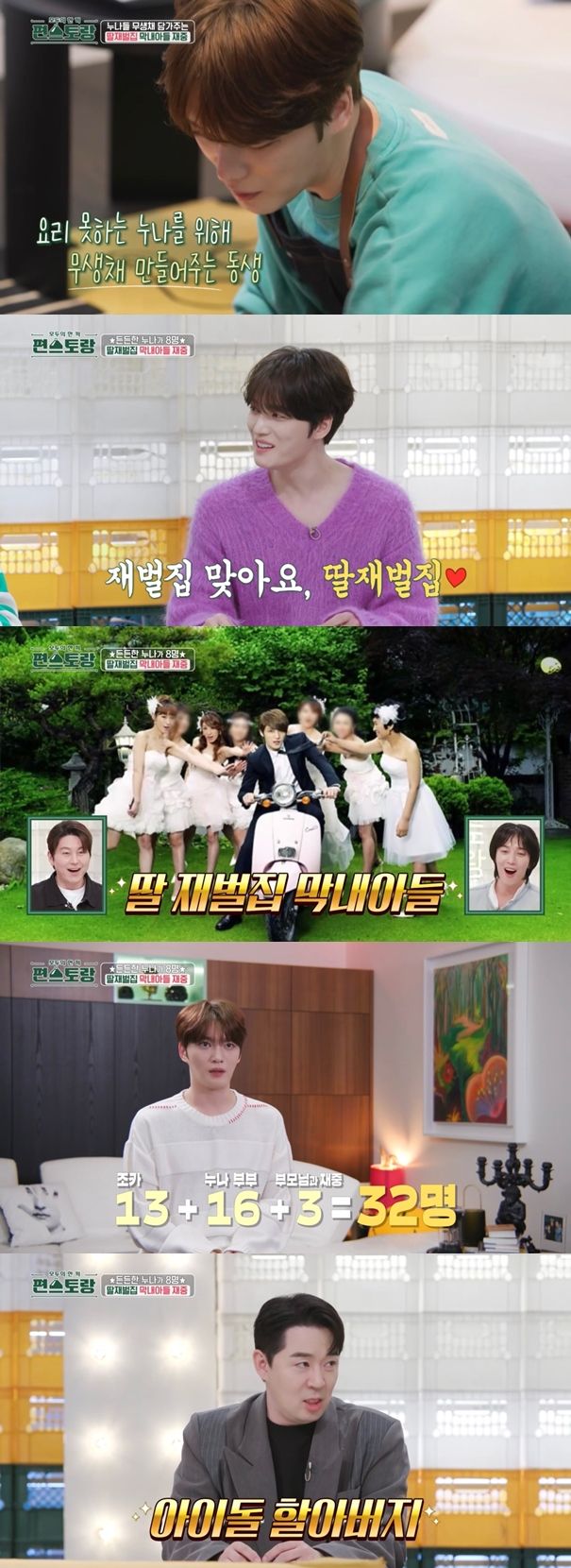 김재중은 "가족이 다 모이면 누나들은 다 결혼을 했으니까 매형들도 (여덟이다.) 또 이제 조카들도 있다. 조카가 열둘? 열셋? 기억이 안 난다. 너무 많다"라며 "조카 열셋에 부부 16명 아버지, 어머니, 나 해서 총 32명이다"라고 밝혔다.