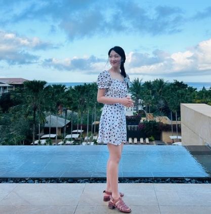미니 원피스를 입은 김혜윤은 쭉 뻗은 각선미를 자랑하며 청순한 분위기를 발산하고 있다. 그녀의 미모는 마치 물 위에 떠 있는 꽃처럼 아름답다.