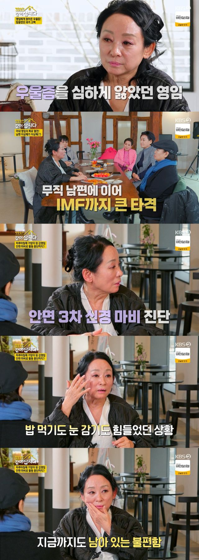 그러면서 김영임은 "또 어느 날 공연 중 얼굴이 굳어 안면 3차 신경 마비 진단을 받았다"면서 "얼굴의 반이 굳어 말도 못 하고 눈 감기도 힘들었다. 다행히 4개월이 지나 조금씩 회복이 됐는데 지금도 약간 불편하다"고 당시를 떠올렸다.
