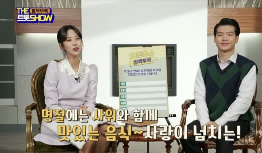 ‘더 트롯쇼 별책부록’에서는 "연속적인 강추위를 이어가고 있는 요즘, 강추위를 녹여줄 달달한 러브송 TOP10 트로트 차트를 준비했다"라며 스페셜 MC 강혜연과 조명섭이 퀴즈를 통해 맞혀보는 코너를 선보였는데요.