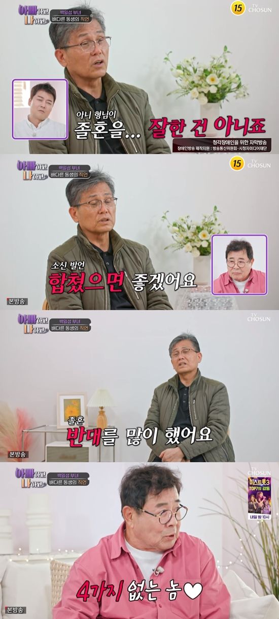 특히 동생은 제작진과의 인터뷰에서 "형님이 졸혼을 잘한 건 아니다"라고 소신발언해 눈길을 끌기도 했다. 백일섭은 지난 2016년 연예계 최초 졸혼 선언을 하며 싱글 라이프를 이어가고 있다. 동생은 "형에게 이런 말 해본 적 있냐"는 제작진의 물음에 "해본 적 없다. 어려워서 못 한다"면서도 "지금이라도 합쳤으면 좋겠다. 형님도 외로움을 많이 타는데 형수님 만나고 결혼해서 행복한 것 같았다"고 이야기했다. 또한 "졸혼 반대를 많이 했다. (졸혼을 말리니까) 그런 말은 하지도 말라고 하더라. 완강했다"고 당시를 떠올렸다.