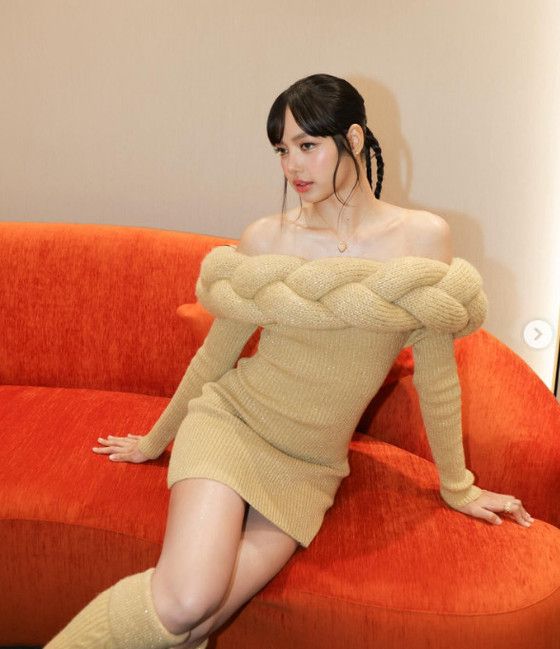 베이지색 니트 원피스를 입은 리사는 팬미팅 대기실에서 포즈를 취하고 있다. 화사한 미소와 탄탄한 몸매는 팬들의 시선을 사로잡았다.