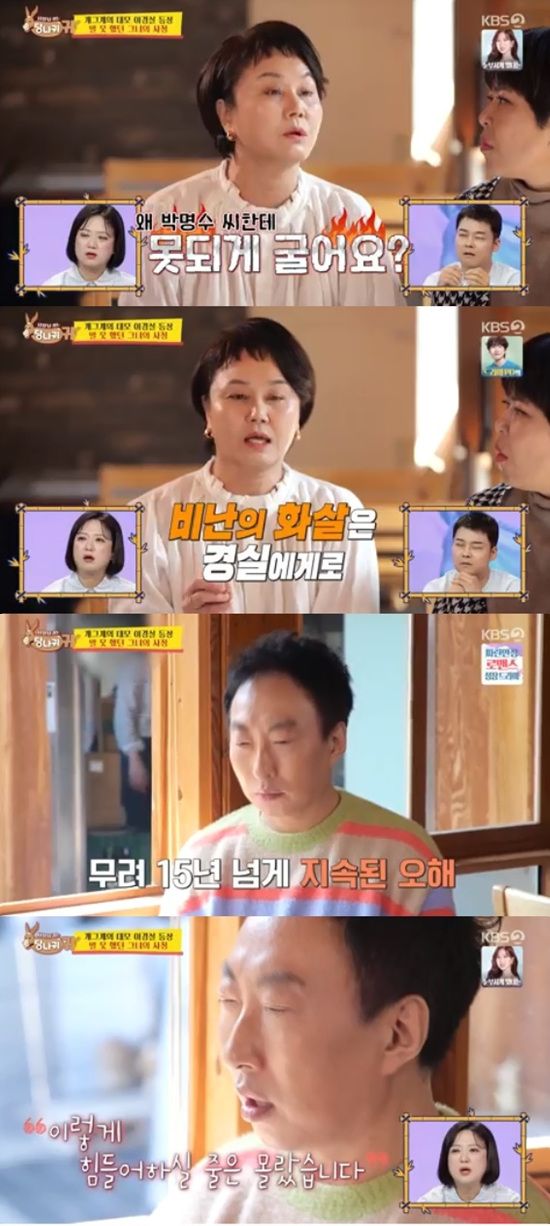 이경실은 "무섭다는 말이 상처더라. 조금 목이 메이려고 하는데 너는 재미있자고 하는 얘기인데 '왜 박명수 씨한테 못되게 굴었느냐'고 하더라. 한 두 명이 아니었다. 내가 지금까지 그런 얘기를 듣는다. 난 그게 스트레스였다"며 살짝 눈물을 글썽이기까지 했다.