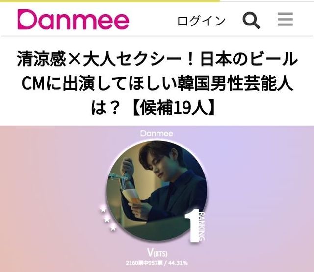 한국 남자 연예인 중에서도 가장 인기 있는 아이돌 그룹 방탄소년단의 멤버 뷔가 일본에서 진행된 맥주 광고에 출연했다. 일본 연예 미디어 '단미'가 진행한 설문에서 뷔는 44.31%의 투표율로 1위를 차지했다.