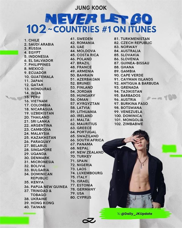 지난 7일 발매된 정국의 새 디지털 싱글 'Never Let Go'가 글로벌 음원 플랫폼 '아이튠즈'(iTunes)에서 총 102개 국가(지역) 아이튠즈 톱 송 차트 1위를 차지했다. 이는 2024년 노래 가운데 가장 빠르게 달성한 기록이자, 2024년 K-팝 가수 노래 중 가장 많은 국가에서 1위를 차지한 성과다.