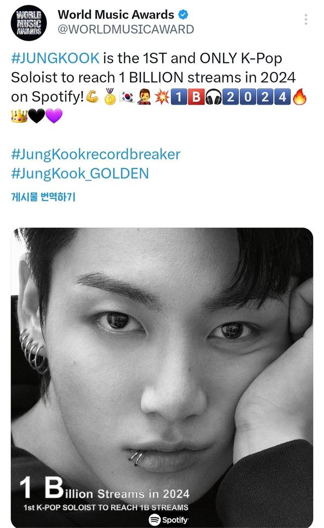 지난해 11월 발매한 자신의 솔로 앨범 'GOLDEN'(골든)으로 스포티파이 역대 K-팝 솔로 가수 앨범 최초이자 아시아 가수의 정규 음반(studio album) 최단 30억 스트리밍(필터링 전)도 돌파한 정국은 스포티파이 개인 계정(프로필) 모든 크레딧으로 역대 K-팝 솔로 가수 최초이자 K-팝 가수 최단 52억 스트리밍(필터링 전)을 기록했다.