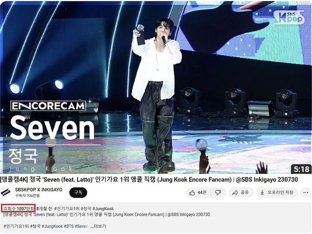 지난해 7월 SBS 인기가요 공식 유튜브 채널에서 '[앵콜캠4K] 정국 'Seven (feat. Latto)' 인기가요 1위 앵콜 직캠' 이라는 제목으로 공개한 정국의 솔로 싱글 'Seven'(세븐) 앵콜 직캠이 1000만뷰를 넘어섰습니다. 영상에서 정국은 반주만 흘러 나오는 MR로 '라이브 제왕'이라는 수식어를 뛰어넘는 생라이브를 선사했습니다.