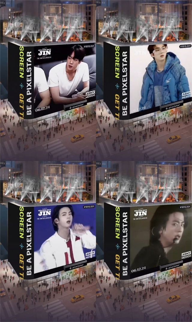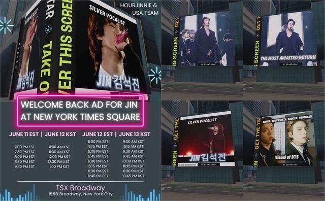 "BTS 진의 전역을 맞이해 전 세계 팬들이 화려한 서포트로 뜨겁게 환영했습니다. 미국 뉴욕 타임스퀘어에서는 가장 큰 스크린인 18000평방피트의 TSX 브로드웨이 스크린을 통해 진의 전역을 축하하는 광고가 송출되었고, 미국팬들은 이를 통해 진의 전역을 응원했습니다.