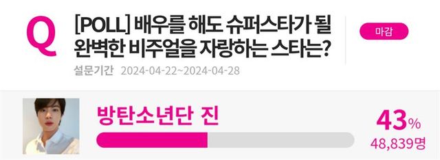 최근 아이돌차트(Idol Chart)에서 진이 4만 8839표를 얻으며 43%의 압도적인 득표율로 '배우를 해도 슈퍼스타가 될 완벽한 비주얼을 자랑하는 스타' 1위에 올랐다.