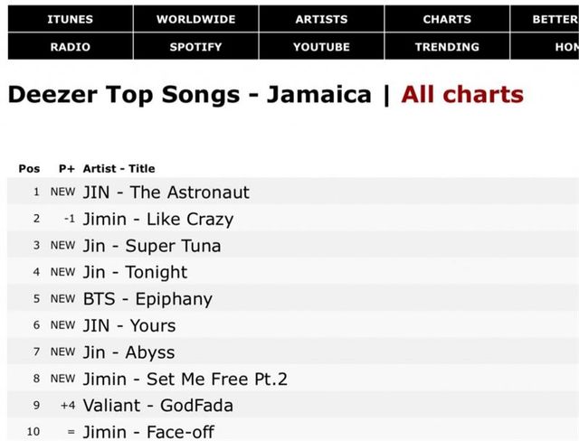 BTS 진이 민간인으로 복귀한다. 복귀를 앞두고 진은 막강한 음원 파워를 선보였다. 진의 첫 솔로 싱글 '디 애스트로넛'(The Astronaut)이 최근 '디저 탑 송 자메이카' 차트에서 1위를 차지했다. 이는 진의 또 다른 솔로곡 '슈퍼 참치'(Super Tuna)가 3위, '이밤'(Tonight) 4위, '에피파니(Epiphany)' 5위, '유어스'(Yours) 6위, '어비스'(Abyss) 7위와 함께 솔로 6곡이 TOP10에 진입한 것을 의미한다.