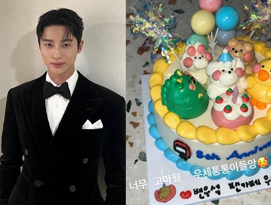 사진에는 변우석의 팬들이 선물한 케이크의 모습이 담겼다. 오리, 곰, 공룡 등 귀여운 캐릭터들이 입체 형태로 올라가 있는 케이크로 단번에 이목을 사로잡는다.