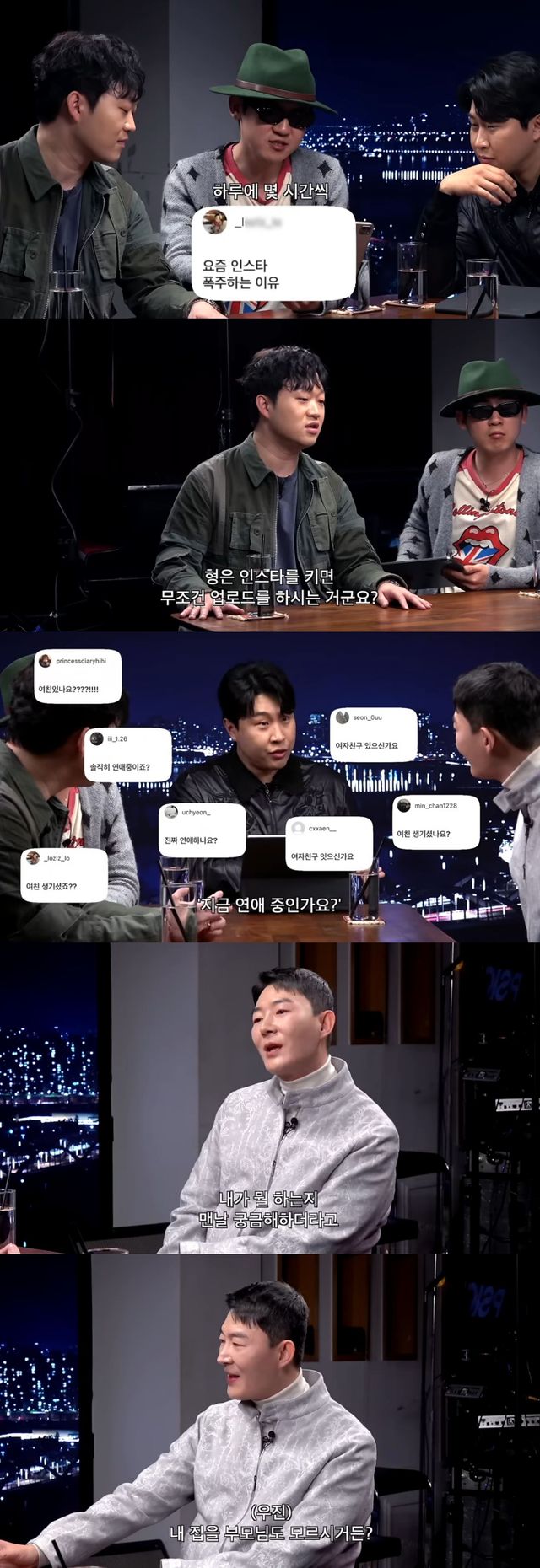 이날 현우진은 항상 촬영하는 탓에 2시간 정도만 휴대폰을 사용한다고 밝혀 세 사람을 놀라게 했다. 그리고 가장 많았던 질문인 현우진의 연애 여부에 대해선 "그건 내 사생활이다. 그냥 대답하고 싶지 않다"고 솔직하게 대답했다.