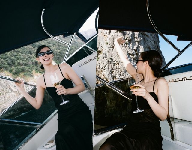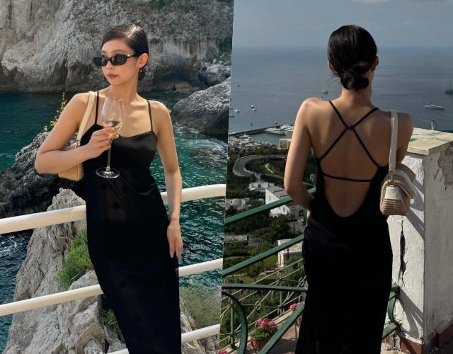 제니는 블랙 선글라스와 블랙 슬립드레스를 입고 카메라 앞에 선 모습이다. 그녀의 섹시한 몸매는 블랙 드레스를 통해 더욱 부각되었다. 제니만이 소유한 아름다움을 강조하는 스타일링은 팬들의 눈길을 사로잡았다.