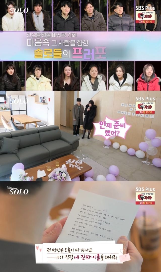 19일 방송된 케이블채널 '나는 솔로(나는 SOLO)'에서는 20기 솔로남녀들이 5박 6일의 여정 끝 최종 선택에 나서는 현장이 공개됐다. 이날 최종선택을 앞두고 솔로남녀들은 마음속 그 사람을 향한 진심을 전할 마지막 기회 '솔로들의 프러포즈' 시간을 가졌다.