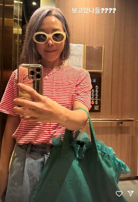 신봉선은 14일 개인 채널에 "보고 있나들?"이라는 글과 함께 사진을 게재했다. 사진 속 신봉선은 엘리베이터 안에서 세련되고 모던한 흰색테의 선글라스를 착용하고 셀카를 찍는 모습이었다. 하얀색과 빨간색이 어우러진 스트라이프 티셔츠로 캐주얼하면서도 생기발랄한 분위기를 뽐내며 시선을 사로잡았다.