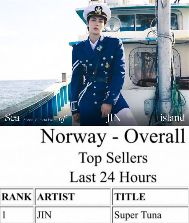 진의 자작곡 '슈퍼 참치'가 최근 노르웨이(Norway) '아이튠즈 톱 송(iTunes Top Song)' 차트에서 1위를 차지했다는 소식이 전해졌다. 이 곡은 리투아니아를 시작으로 미크로네시아, 라트비아, 아제르바이잔 등 총 57개국에서 1위를 차지하며 글로벌 열풍을 일으키고 있다.