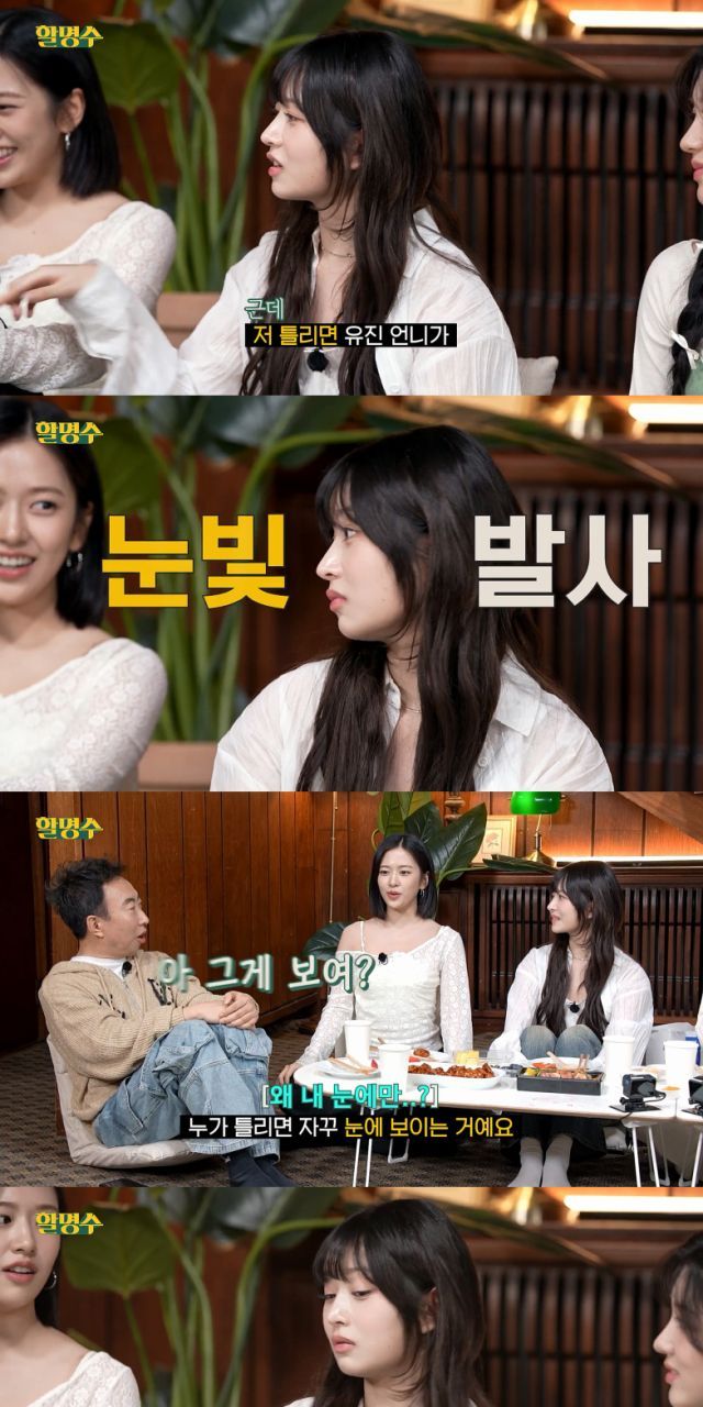 레이는 이어 "그런데 저 틀리면 유진 언니가 눈빛 발사를 한다"고 폭로했고, 안유진은 "이상하게! 누가 틀리면 자꾸 눈에 보이는 거야. 그래서 저도 모르게 '틀렸네?' 이렇게 하면서 쳐다본다"고 해명했다.