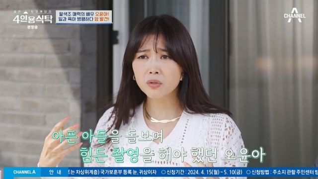 배우 오윤아가 이혼을 결심한 이유를 공개했다는 소식이 전해졌다. 오윤아는 종합편성채널 채널A의 '절친 토큐멘터리 4인용 식탁'에서 절친인 배우 오현경, 한지혜, 걸그룹 투애니원 출신 가수 산다라박을 집으로 초대해 진솔한 이야기를 나눴다.