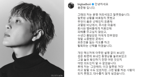 용준형은 자신의 블로그에 "안녕하세요 용준형입니다"라는 제목으로 긴 글을 게재했습니다. 그는 "그때의 저는 어리석었고 잘못했습니다. 잘못된 상황을 바로잡지 못했고 무엇이 옳은 선택인지 모른 채 과열된 비난에서, 무서운 마음에 회사와 멤버들에게 저로 인해 피해를 주고 싶지 않았고, 수년간 몸담았던 저에게 전부였던 정말 소중했던 곳에서 모든 것을 잃는 각오를 하고 탈퇴라는 선택을 하였습니다"라며 과거 논란에 대한 사과와 후회의 뜻을 밝혔습니다.
