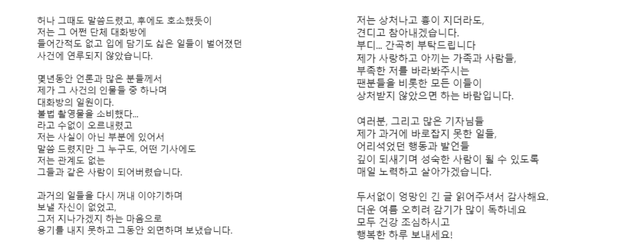 그는 "이번 논란으로 많은 분들께 심려를 끼쳐드려 죄송하다는 말씀을 드리고 싶습니다. 앞으로는 이러한 일이 다시 발생하지 않도록 매일 노력하고 살아갈 것입니다"라고 덧붙였습니다.