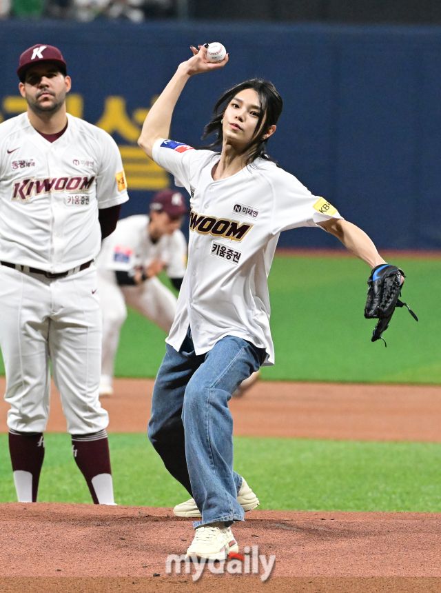 6일 오후 서울 고척스카이돔에서 진행된 '2024 신한 SOL 뱅크 KBO 리그' 한화-키움의 경기에서 그룹 웨이커 이준이 마운드에 올라 시구를 했다. 이준은 진지한 눈빛으로 마운드를 바라보며 경기를 시작했다. 그의 시구는 정확하고 강력했고, 이를 받은 키움 타자들은 무기력한 모습을 보였다.