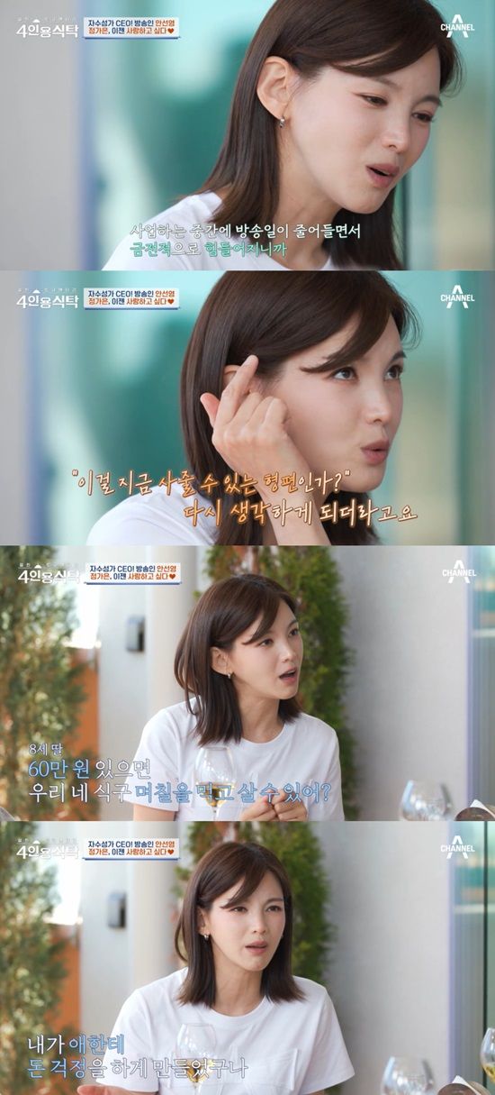 채널A '절친 토큐멘터리 4인용 식탁'에 출연한 정가은은 딸의 질문에 답하며 자신의 근황을 밝혔다. 안선영이 모친의 빚을 갚았다는 소식을 듣는가 하면 사업으로 자주성가 한 이야기를 듣고 감탄했다.