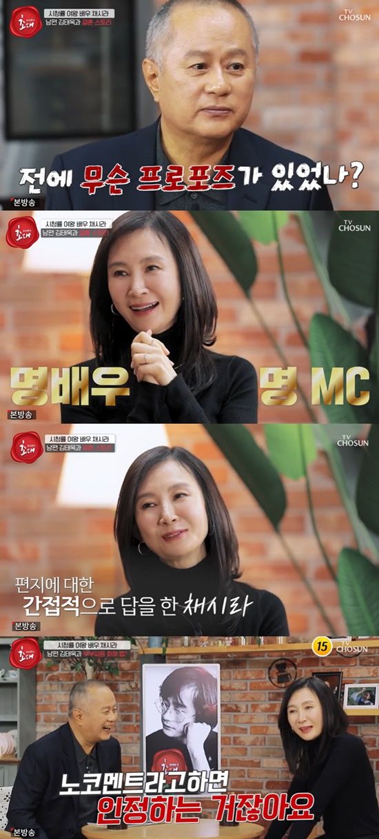 채시라는 "사귀고 있는 것은 이미 알려진 상태였다. 김태욱 씨가 '오늘 뭔가 받을 것 같다'면서 편지하고 선물을 줬다. 시상식 다 끝나고 풀러보라더라"고 떠올렸다. 궁금한 마음에 편지를 봤더니 '같이 있고 싶다'라면서 '시라 씨의 넓은 운동장이 되어주겠다'라는 멘트가 눈에 들어왔다고. 이를 통해 채시라는 김태욱의 프러포즈를 받은 것으로 밝혀졌다.