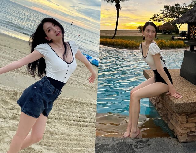 강지영이 여유로운 휴양지에서 아름다운 곡선을 자랑하는 수영복 차림으로 여전한 아우라를 발산했다.