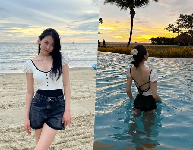 화이트 상의와 블랙 하의로 구성된 수영복은 강지영의 성숙해진 매력을 더욱 돋보이게 한다. 특히 청바지를 매치해 여성스러운 강지영의 몸매라인을 더욱 부각시켜 시선을 사로잡는다.