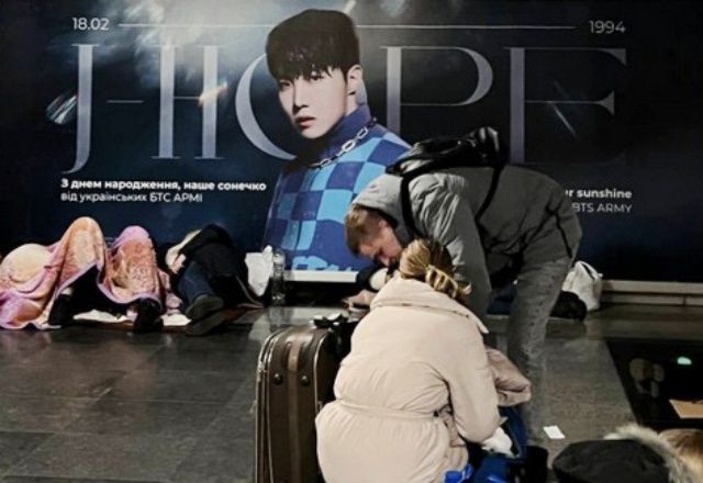 "우크라이나 수도 키이우에서 방탄소년단 팬들이 멤버 제이홉의 생일을 축하하는 광고를 걸고 생일 잔치를 열었습니다. 그러나 일주일 뒤, 제이홉 사진 앞에는 러시아의 공습을 피해 전쟁 피난민들이 모여들었습니다. 우크라이나 아미(BTS 팬)들이 소셜 미디어에 올린 이 사진은 전쟁이 어떻게 일상을 파괴할 수 있는지 실감나게 보여주었습니다.