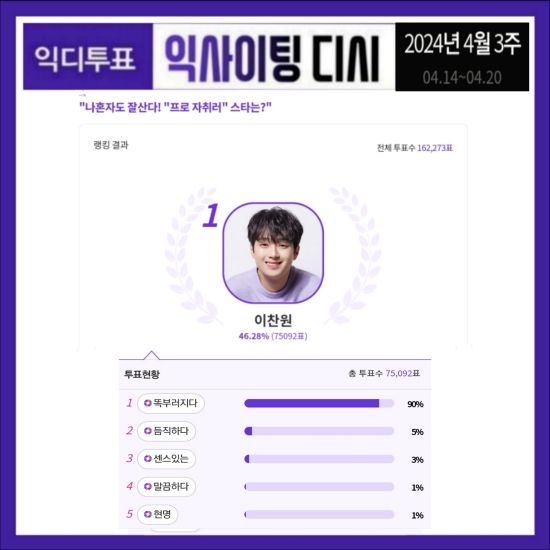이찬원의 매력 키워드 중 '똑 부러지다'가 90%로 가장 높은 비율을 차지했으며, '듬직하다' 5%, '센스 있는' 3%, '말끔하다' 1%, '현명' 1% 등이 뒤를 이었다.