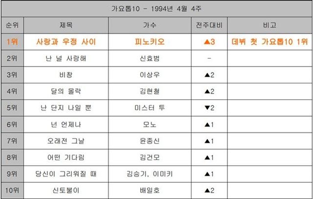 1994년 4월 4주, ‘가요톱10’ 차트를 장식한 곡은 피노키오의 ‘사랑과 우정사이’입니다. 이 밴드는 베이스 김민철을 중심으로 결성되어 1985년 대학가요제에 참여하고 앨범을 발매하는 등 세션 밴드 위주의 활동을 해왔습니다. 이후 1992년 김성면을 보컬로 영입하면서 본격적인 데뷔를 알렸고, 정규 1집 ‘다시 만난 너에게’를 발매하며 대중들의 사랑을 받았습니다. 하지만 이 앨범을 끝으로 보컬과 기타(안정훈)가 팀을 떠나게 되면서 피노키오는 사실상 ‘기수제’를 도입하게 됐습니다. 그 후 멤버들이 계속해서 변화하며 현재는 드럼에는 조한철, 보컬에는 황가람이 함께 멤버로 활동하고 있습니다.