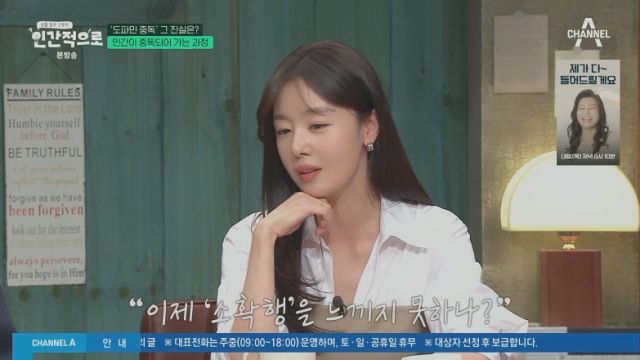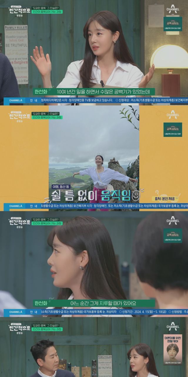 한선화는 8일 오후 방송된 종합편성채널 채널A '생활 밀착 인문학 - 인간적으로'에 인문학 메이트로 등장했다. 이날 방송에서는 '도파민 중독'에 대한 이야기가 나눠졌는데, 정치학자 김지윤은 "NIH(미국 국립보건원)에서 우리가 일상에서 느끼는 도파민 적정 수치가 100이라고 할 때 월급·쇼핑 등 보상을 받으면 150, 키스를 하면 195, 흡연을 하면 225, 연애를 하면 500, 짝사랑과 사귀게 되면 700, 마약을 하면 1300으로 올라간다"고 전했다.