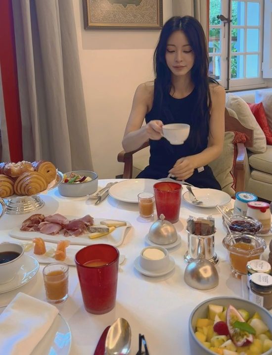 사진 속 한예슬은 리조트에서 아침 식사를 즐기는 듯 보인다. 빵과 햄, 치즈와 음료 등으로 가득 찬 테이블 앞에서 찻잔을 들고 여유를 즐기는 그녀의 모습은 마치 영화 속 주인공처럼 아름답고 로맨틱했다.
