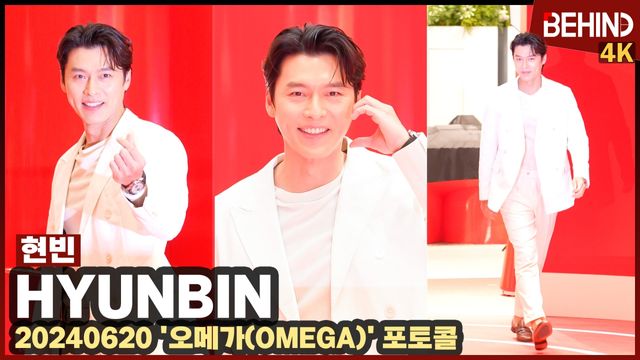 배우 현빈이 6월 20일 서울 강남구 신세계백화점 강남점에서 열린 '오메가' 파리 올림픽 기념 팝업 이벤트 포토콜 행사에 참석해 화이트 수트를 입고 미소를 지으며 포토타임을 가졌다.
