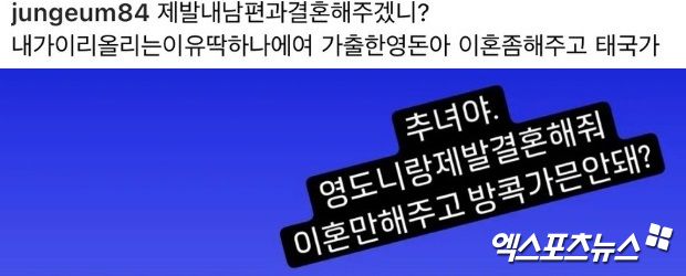 일부 네티즌은 "네가 그런 생각을 가지고 있으니 남의 남편 탐하는 거야"라며 전 남편의 금전적 선물 등의 발언이 담긴 폭로글을 게재했다. 이어서 해당 글이 적힌 게시글은 게재 직후 삭제됐다.