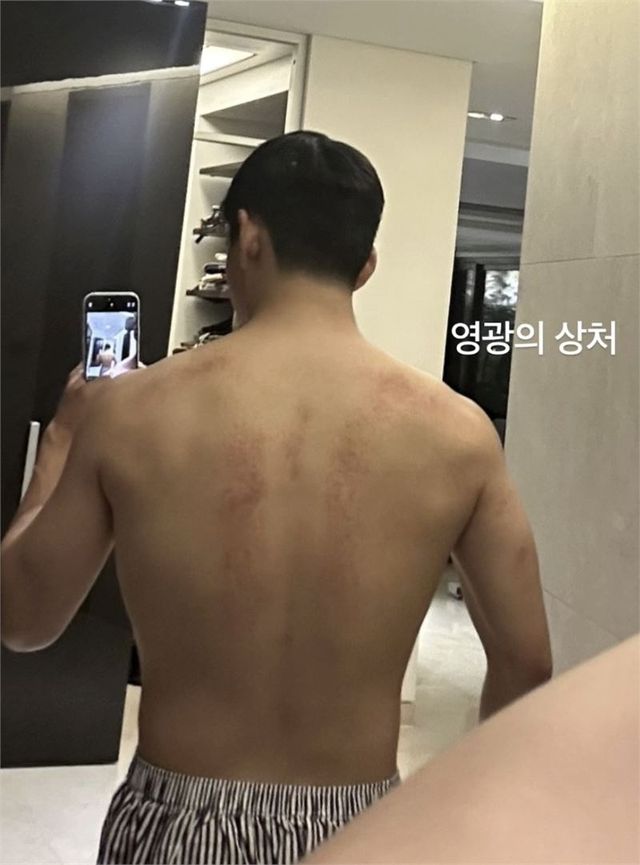 최근 뷔는 팬 커뮤니티 위버스와 자신의 인스타그램에 근황을 담은 사진들을 올려 팬들의 눈길을 사로잡았다. 위버스에는 "영광의 상처"라는 글과 함께 한 장의 사진을 게재했다. 상탈을 한 뷔의 상반신이 담겨있는 사진에서는 훈련으로 인해 생긴 상처가 빨갛게 자국을 남겼지만 뷔는 여전히 늠름하고 의연한 모습을 보였다.