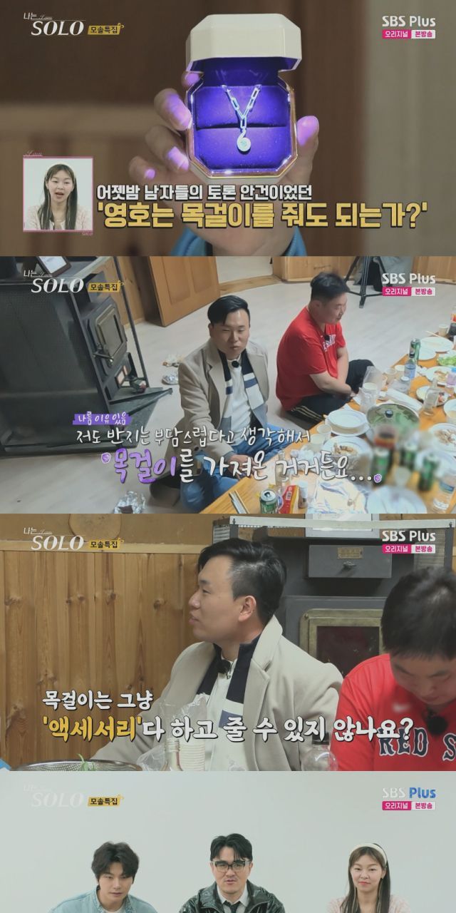 하지만 영호는 솔로남들의 만류에도 "목걸이는 그냥 액세서리다"며 자신의 의견을 굽히지 않았다. 이에 광수는 "영호님 내가 마지막으로 얘기하는데... 목걸이는 아니야", 상철은 "차라리 더 만나보고 싶다고"라고 말했다.