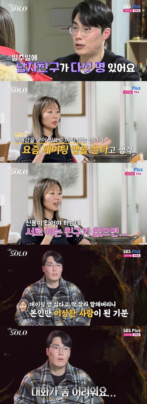 이에 반해 옥순은 "음, 그렇구나. 나는 데이팅 앱을 쓰는 것이 나에게는 안 맞아. 천천히 알아가야 하니까"라며 "서로 아는 친구가 없으면 어디서부터 신뢰를 쌓아야 할지 막막하다"고 말했다. 이에 영철은 "한국에서는 데이팅 앱을 꺼리지만 미국에서는 전혀 문제가 되지 않는다"며 상황의 차이를 설명했다.